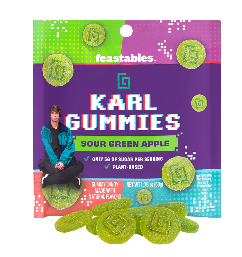 Feastables Karl Gummies Sour Green Apple are a sour indulgence made from tart green apples. Each gummy is bursting with flavor, making them a sweet and tangy treat that's sure to delight the taste buds. Enjoy these delicious gummies individually or share with friends.